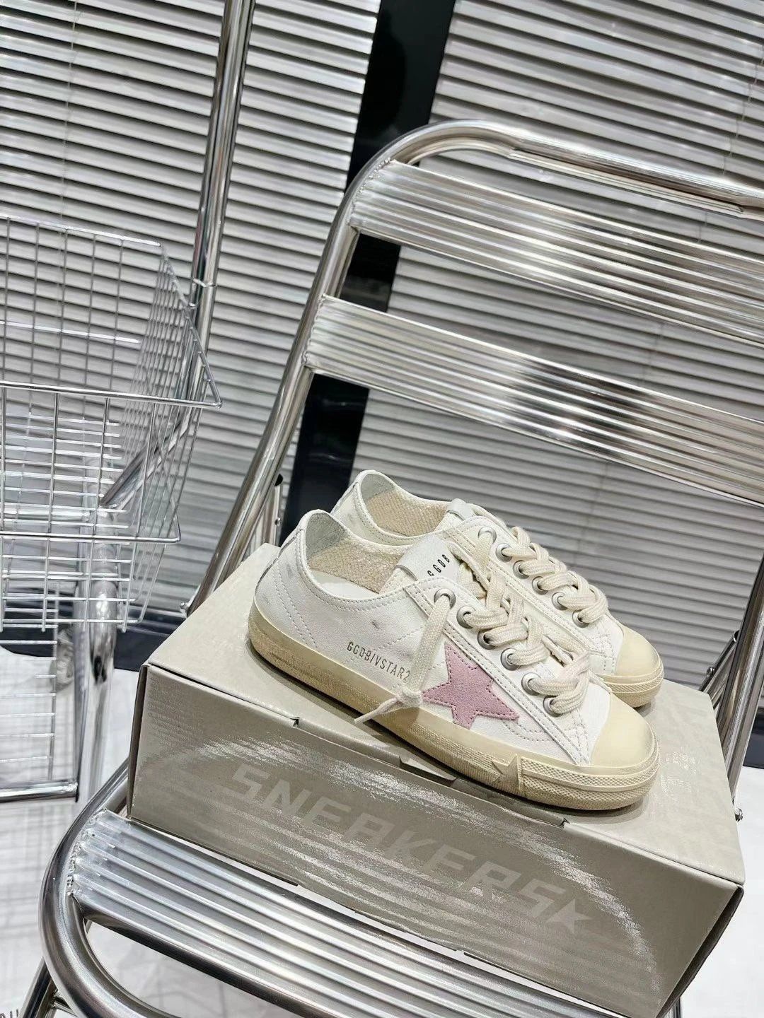 Golden Goose white vintage low-top sneakers with pink star detail, premium leather and canvas blend, unisex casual style.