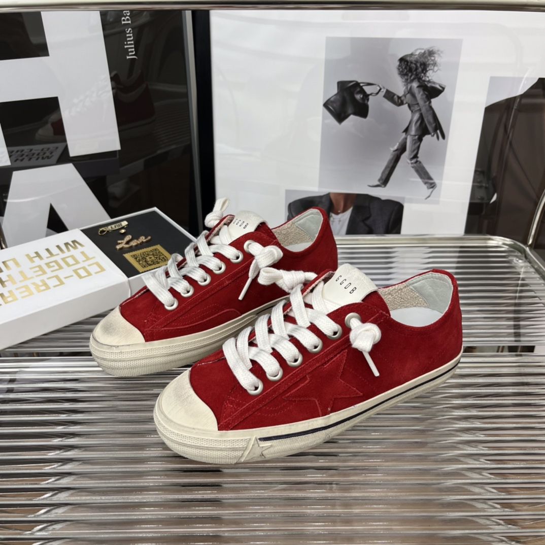 Golden Goose red low-top sneakers feature premium suede and canvas mix, iconic star detail, vintage distressed sole, unisex design, perfect for Italian street style and everyday comfort.