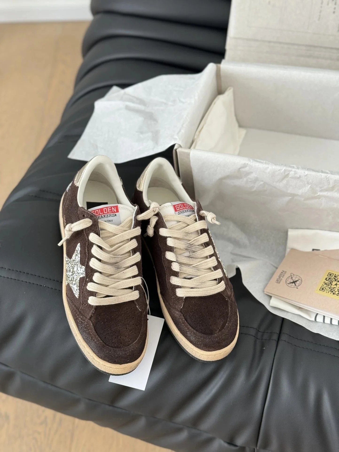 Golden Goose brown suede low-top sneakers with silver glitter star, vintage-inspired design for men and women, combining Italian craftsmanship with effortless casual elegance.