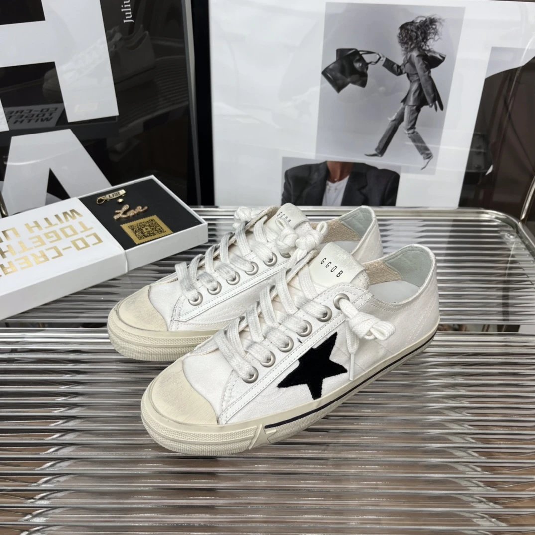 Golden Goose white low-top sneakers with black star logo, premium leather and canvas mix, vintage distressed style, unisex casual fashion shoes perfect for everyday wear.