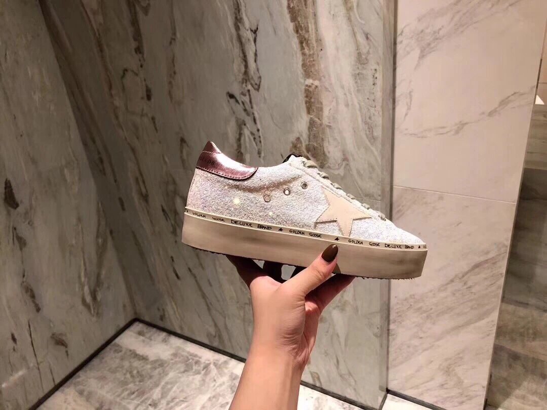 Golden Goose silver glitter platform sneakers with suede star, metallic pink heel, soft breathable leather, unisex retro luxury street style.