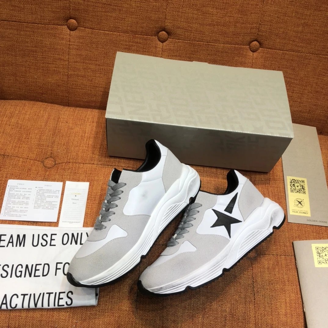 Golden Goose grey-white sneakers with premium leather and suede, iconic black star, thick sole for shock absorption and comfort, unisex streetwear style.