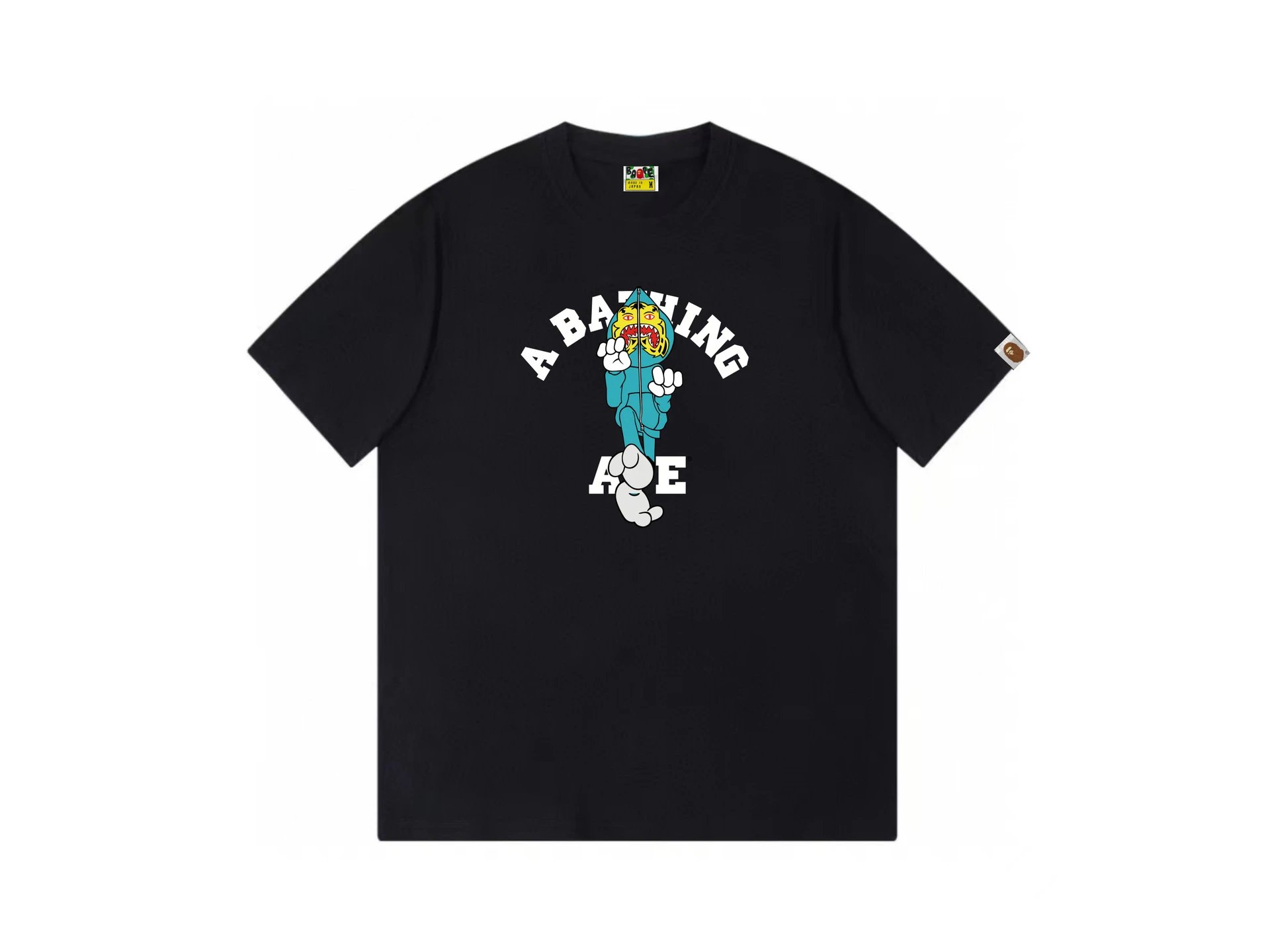 A Bathing Ape black cotton T-shirt featuring cartoon tiger head and logo print. Streetwear style, classic crew neck, unisex fit. Show your BAPE Japanese urban trend and individuality.