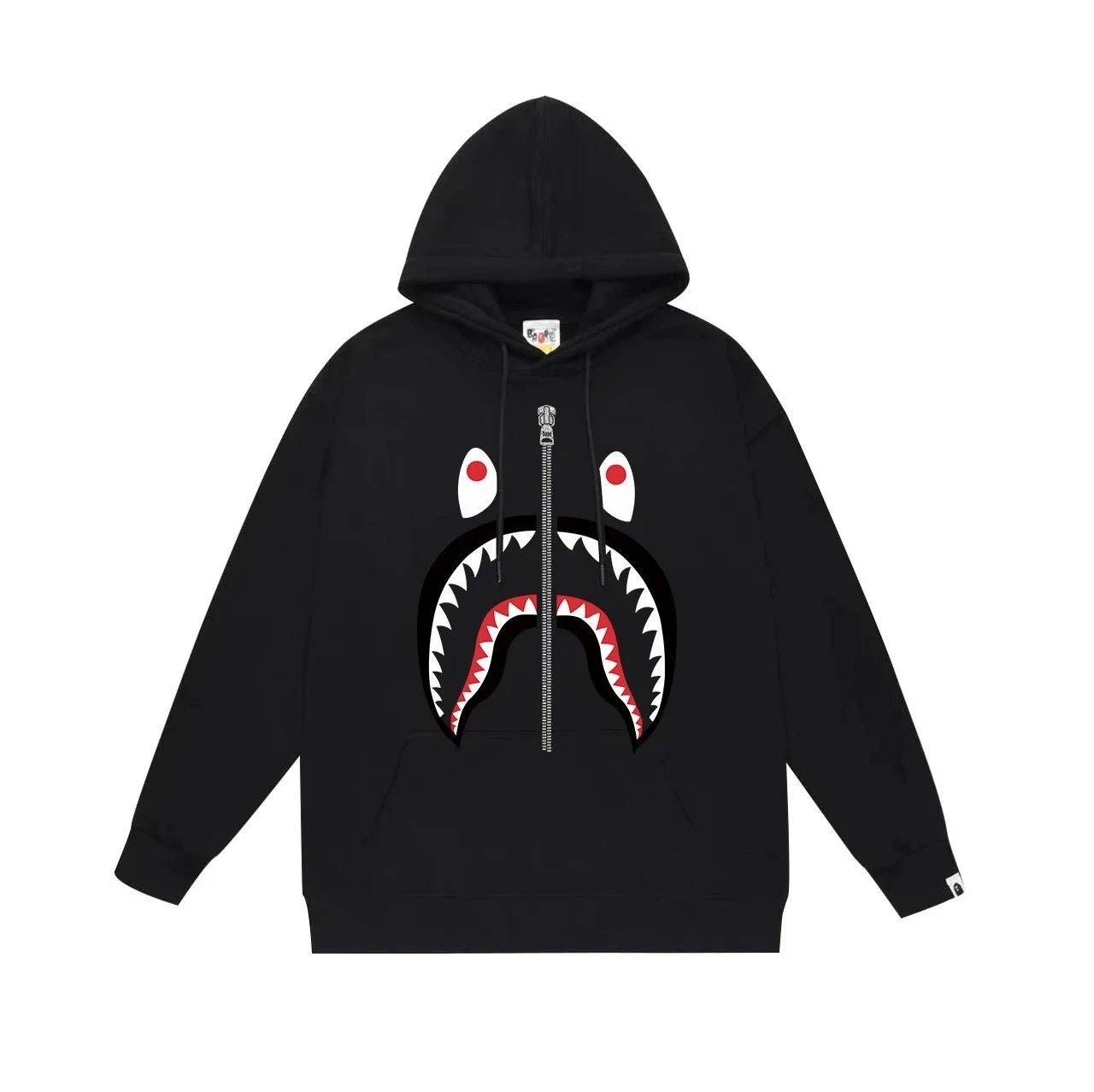 A Bathing Ape black shark print hoodie made from premium cotton, featuring bold shark teeth design, adjustable drawstring, kangaroo pocket, unisex street style for comfort and attitude.