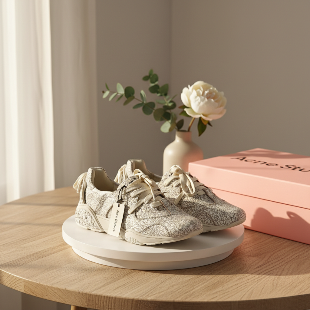 Acne Studios off-white cracked leather sneakers crafted from premium cowhide with chunky sole design, featuring Nordic minimalist aesthetics, breathable comfort, unisex style, and modern urban fashion.