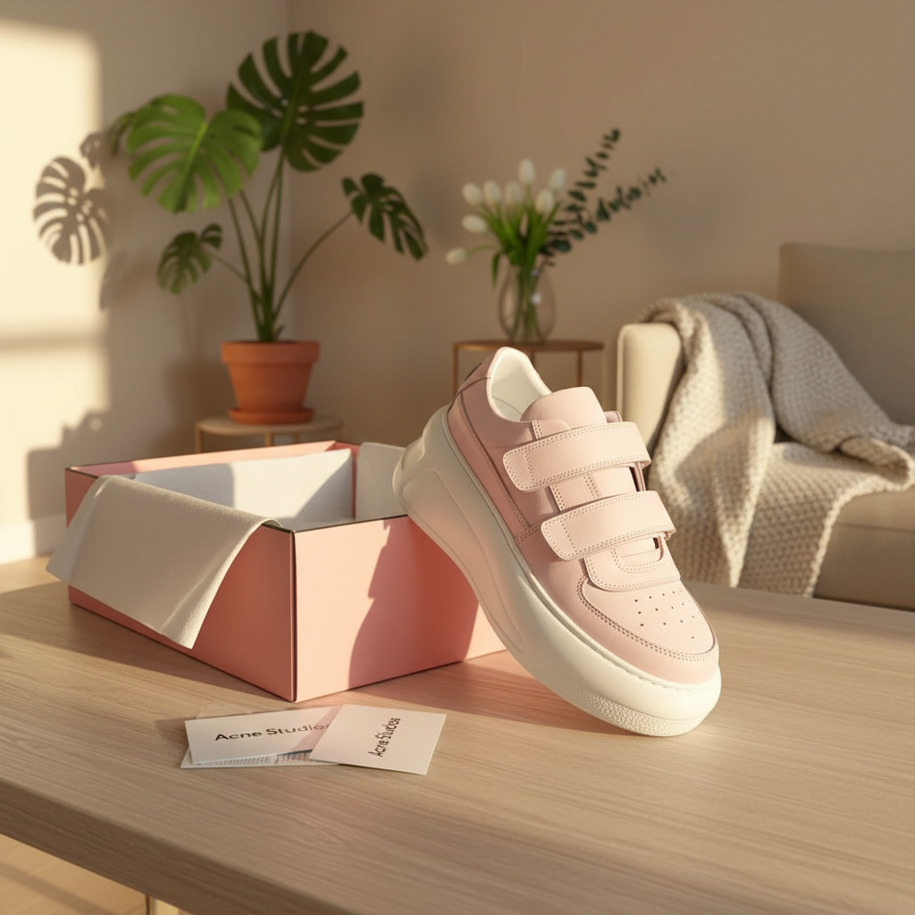 Acne Studios Pink Platform Velcro Calf Leather Sneakers feature minimalist Nordic design, soft premium leather, lightweight sole for lift, unisex style, perfect for modern urban fashion.