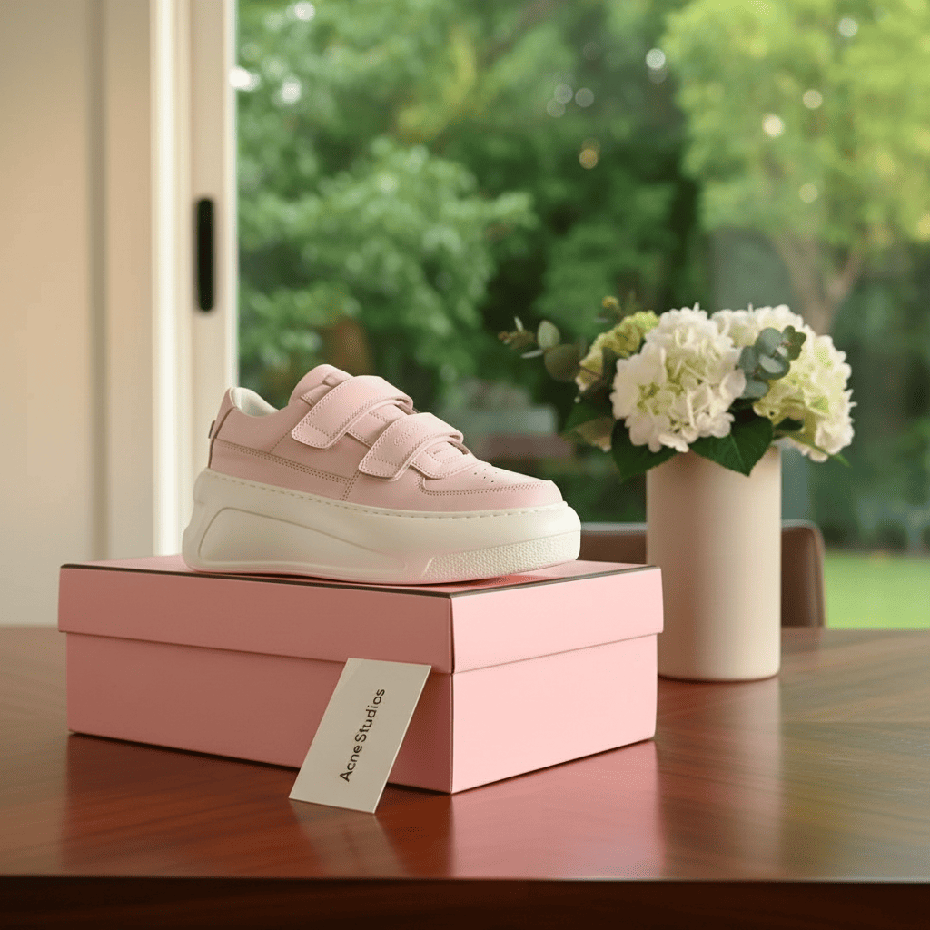 Acne Studios pink platform leather sneakers for women, featuring soft premium leather, easy Velcro straps, minimalist Nordic style, and a comfy elevating sole for chic urban everyday wear.