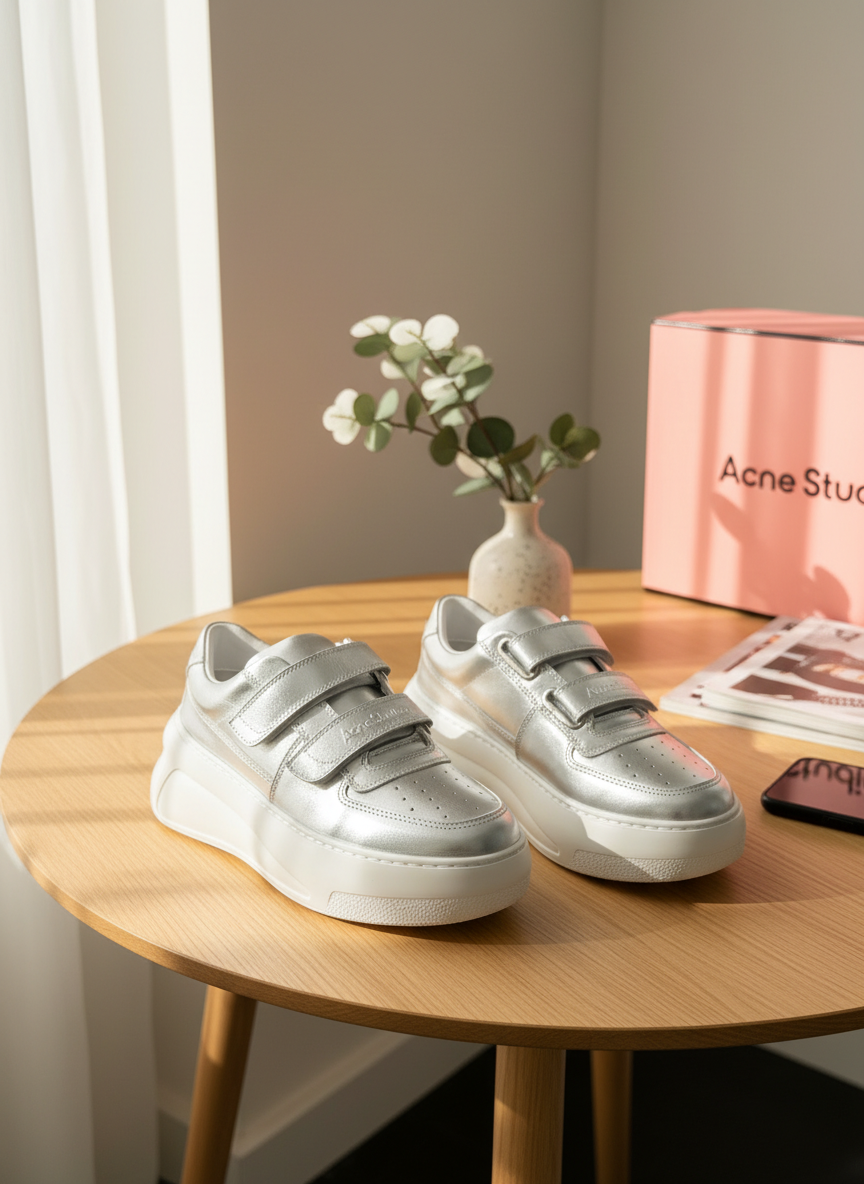 Acne Studios Silver Platform Velcro Sneakers in premium leather, featuring metallic shine, minimalist lines, and 3D sole for height and comfort. Unisex futuristic design for modern urban style.