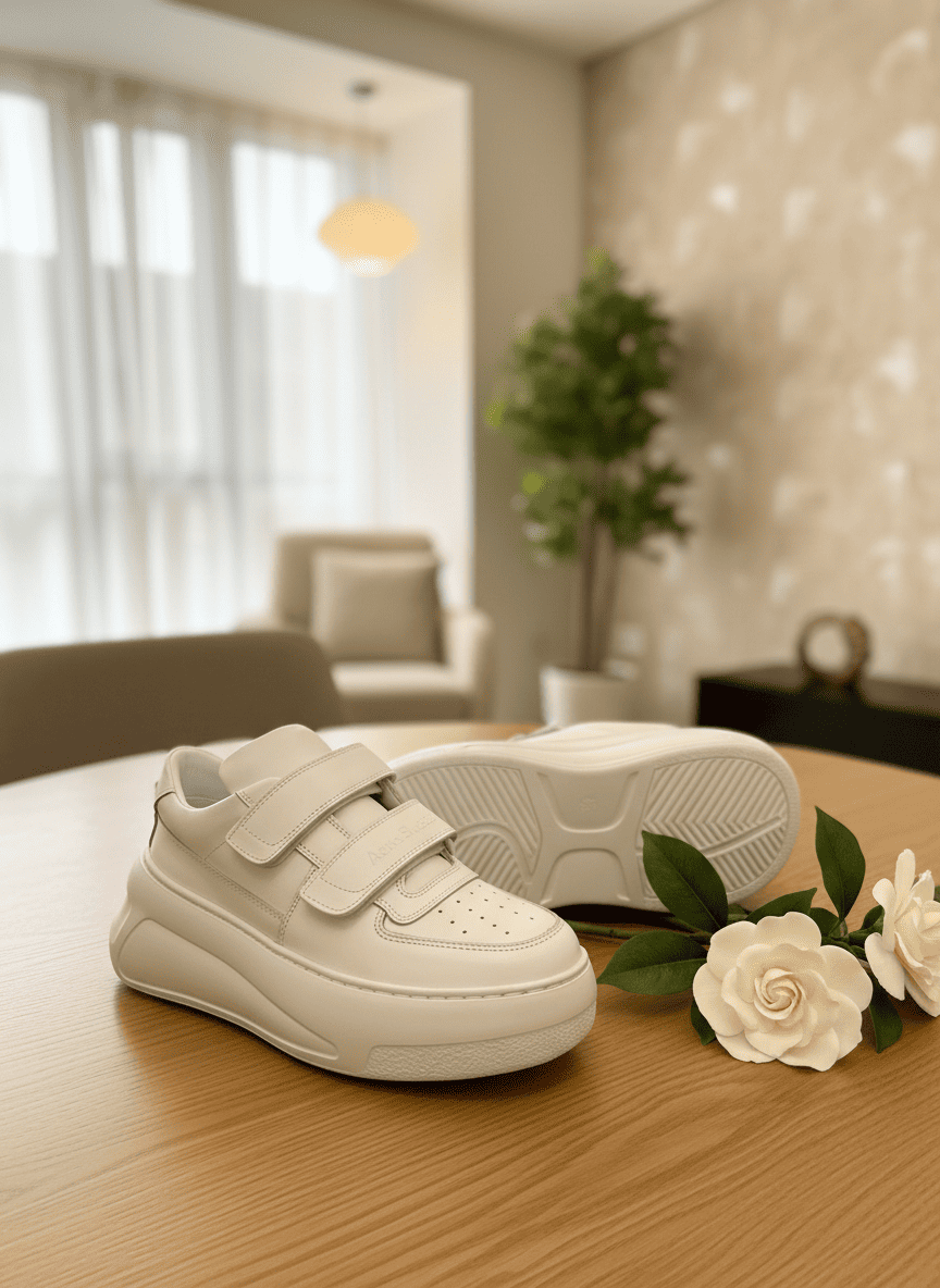 Acne Studios white calf leather platform sneakers feature minimalist Nordic design, unisex style, adjustable Velcro straps, and cushioned sole for comfort and modern urban appeal.