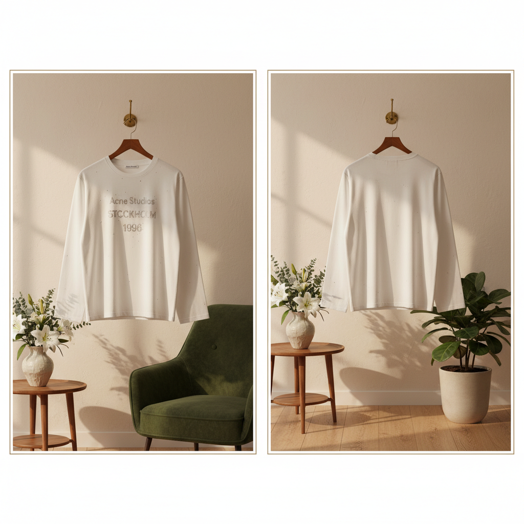 Acne Studios white long-sleeve T-shirt crafted from premium cotton, featuring “STOCKHOLM 1996” logo and paint-splatter detail. Unisex minimalist design for effortless Nordic casual style.