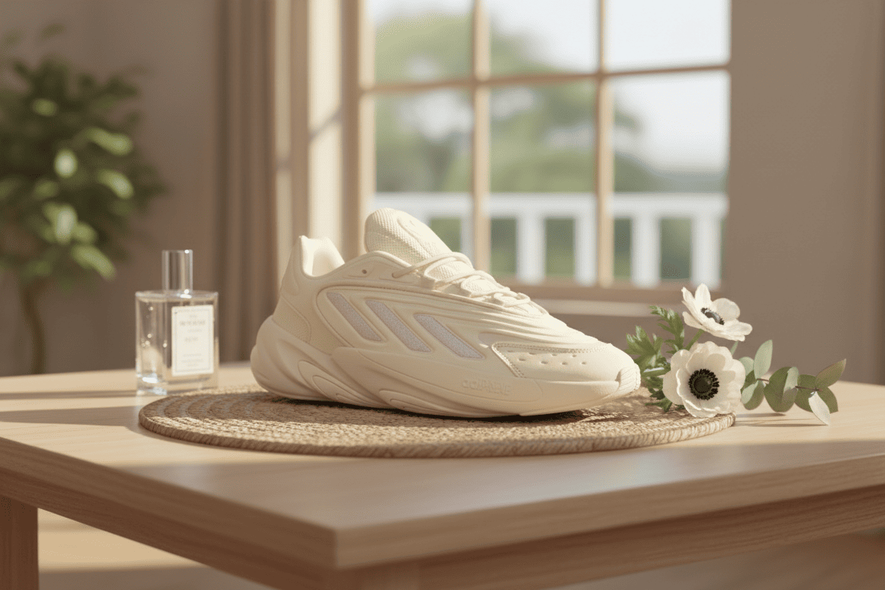 Adidas Cream White Retro Running Shoes with breathable mesh and flexible leather panels, featuring adiPRENE cushioning for all-day comfort and a sleek, unisex modern sporty style.
