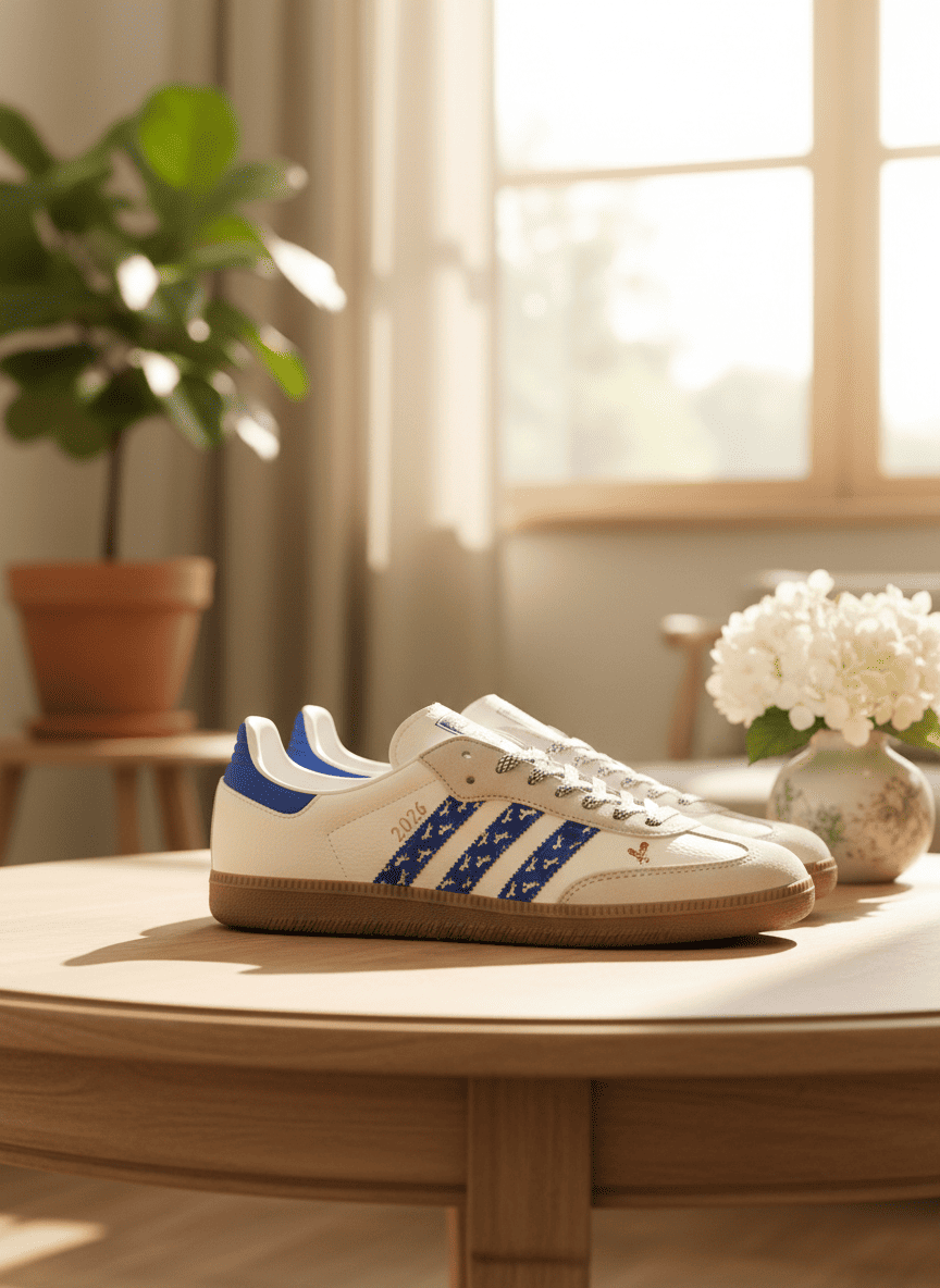 Adidas Retro White Blue Leather Sneakers feature classic three stripes with dynamic equestrian motif, durable non-slip rubber sole, unisex streetwear style blending comfort and fashion.