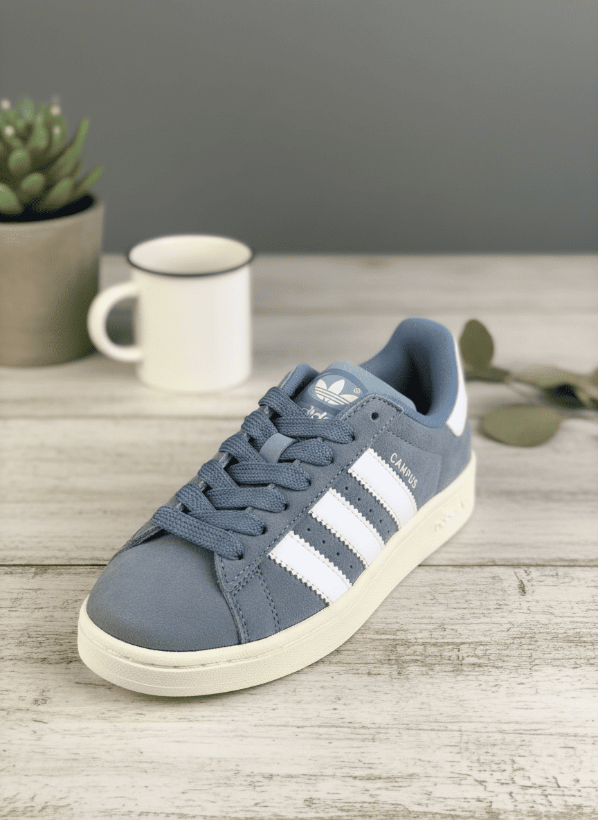 Adidas Campus Light Grey Blue Suede Sneakers feature soft nubuck texture and iconic 3-Stripes design, offering retro simplicity, unisex style, and comfy rubber sole for daily streetwear.