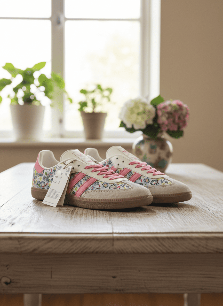 Adidas Floral Pink Casual Shoes feature soft leather-fabric mix, pink three-stripe design, retro-modern style, lightweight cushioned sole, unisex fit, express youthful energy and fashion attitude.