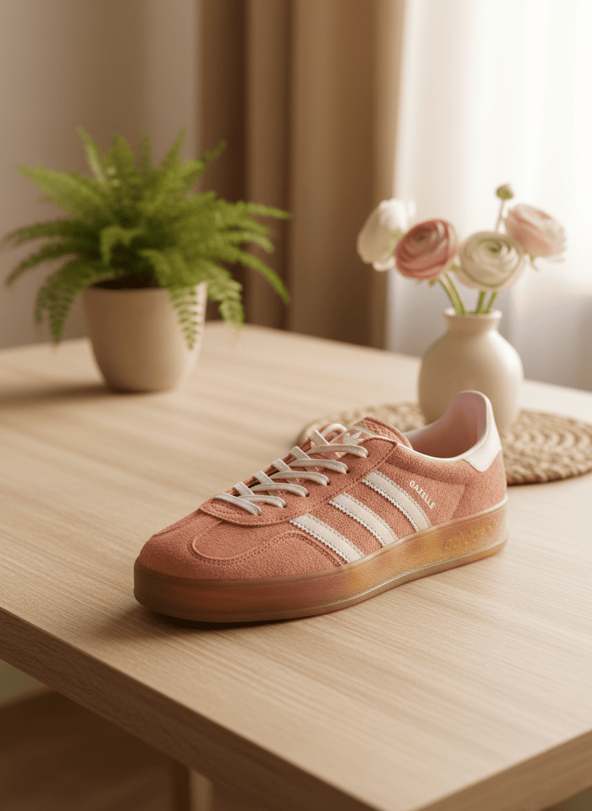 Adidas Gazelle Pink Suede Sneakers: soft suede texture with iconic white 3-Stripes, vintage street style design, durable rubber sole, anti-slip and wear-resistant, unisex urban casual fashion.