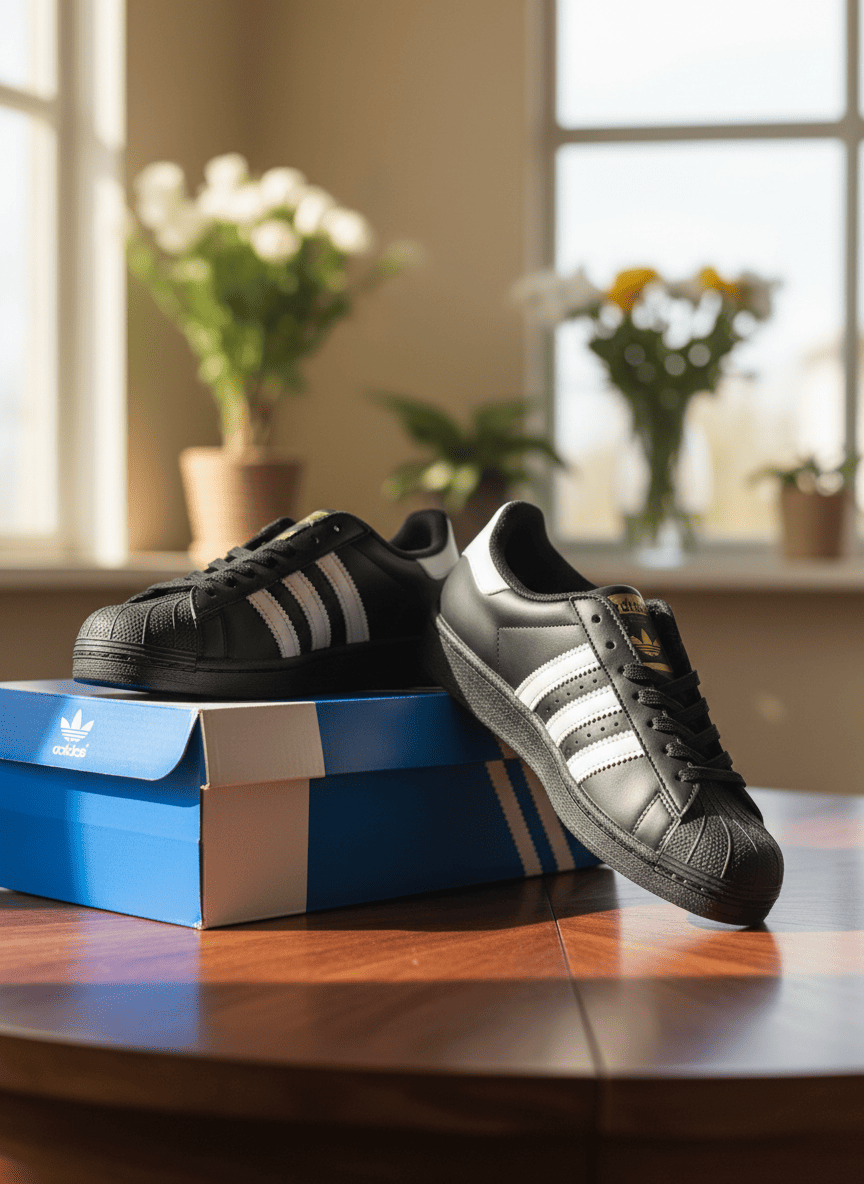 Adidas Superstar Black Shell Toe Sneakers feature premium leather upper, iconic three stripes, gold logo for retro style, breathable lining, anti-slip rubber sole, perfect for men and women streetwear.
