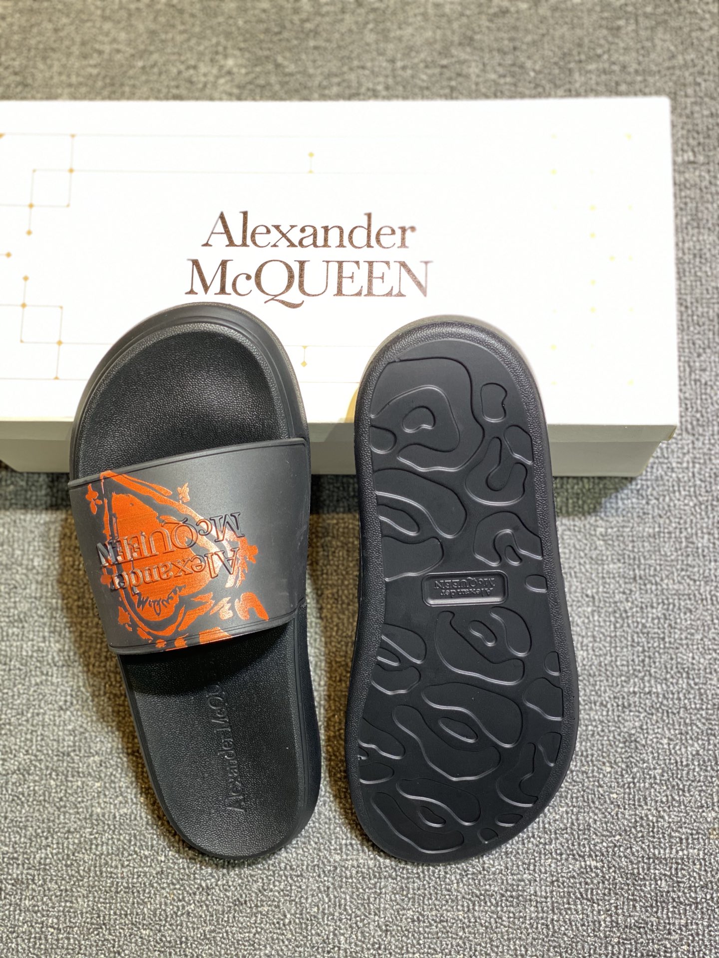 Alexander McQueen black and orange fashion slides made from premium rubber, featuring signature logo pattern, lightweight comfort, non-slip sole, unisex design for modern street luxury style.