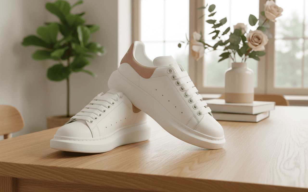 Alexander McQueen white and pink leather sneakers, thick sole design, unisex casual shoes with British elegance, cushioned height boost, stylish minimalist look for everyday comfort.