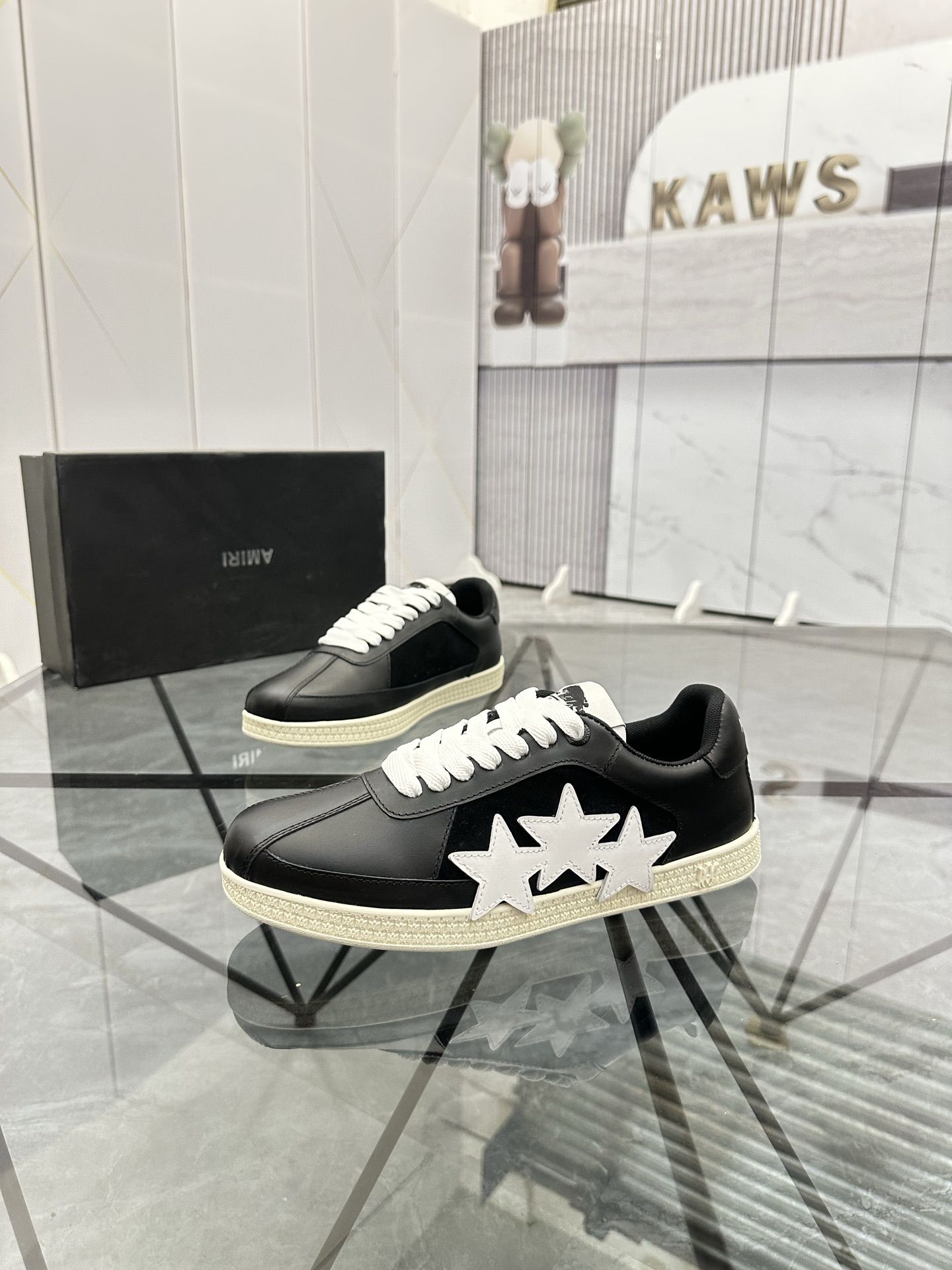 Amiri Black Star Low-Top Sneakers crafted from premium cowhide leather, featuring white 3D star embroidery, non-slip durable sole, lightweight comfort, and unisex luxury street style.