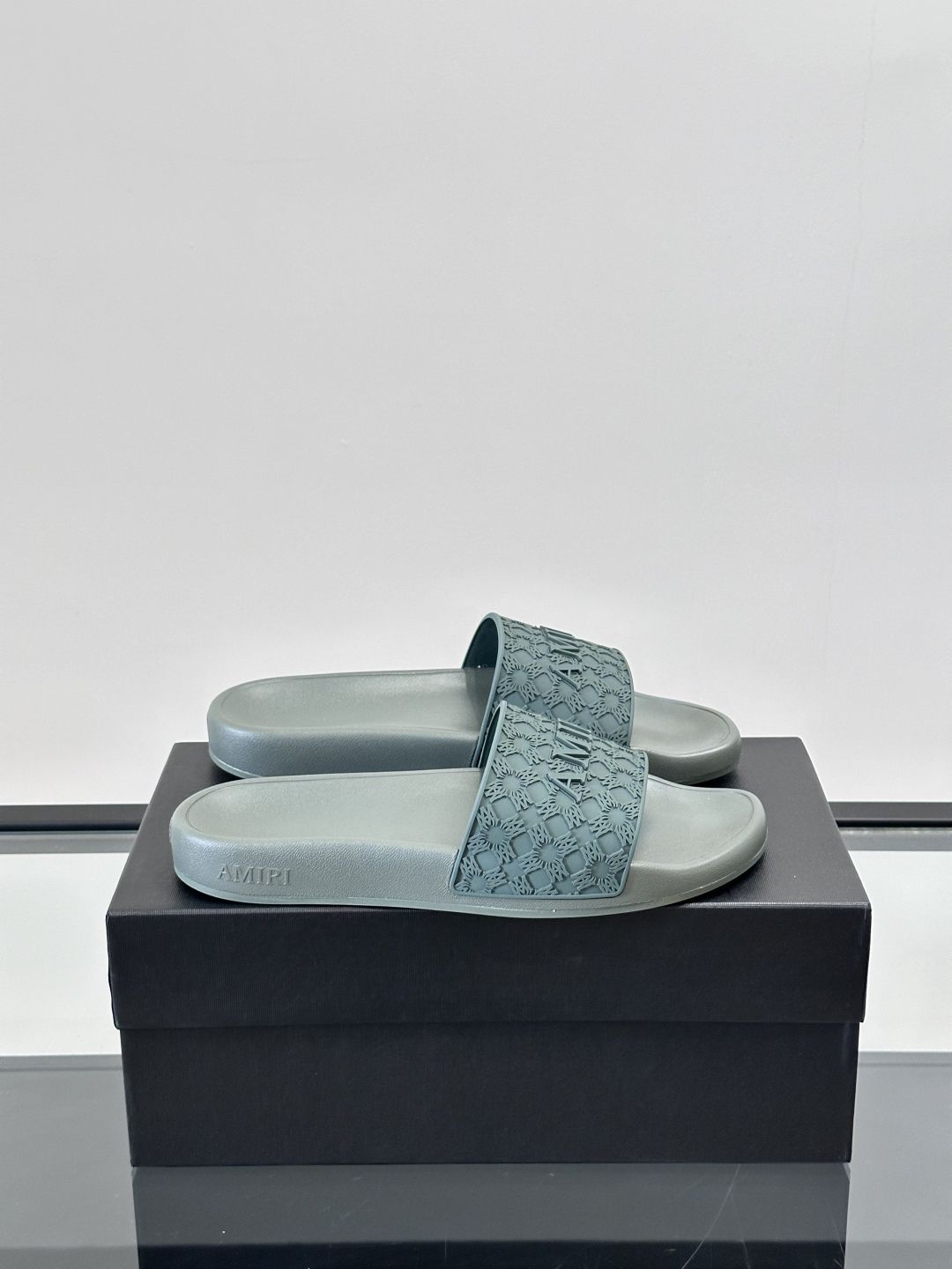 Amiri Grey Green Embossed Logo Slides made from premium textured rubber, showcasing minimalist street style design. Unisex and perfect for summer casual wear and everyday comfort.