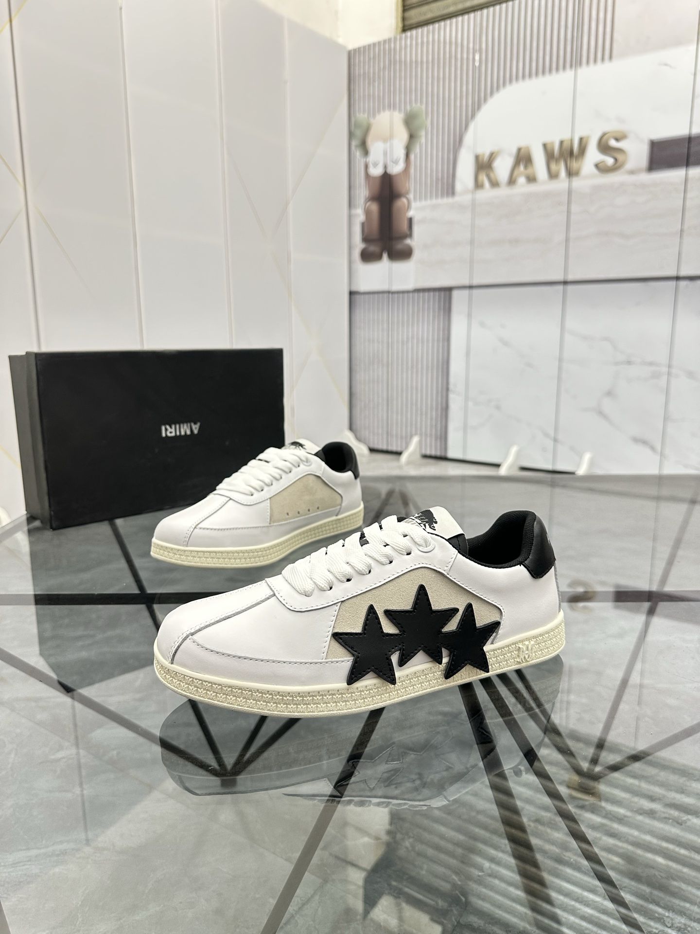 AMIRI white black star sneakers crafted from supple leather and suede, featuring signature triple-star design, low-top unisex style, rubber sole for comfort, perfect for street and daily fashion.
