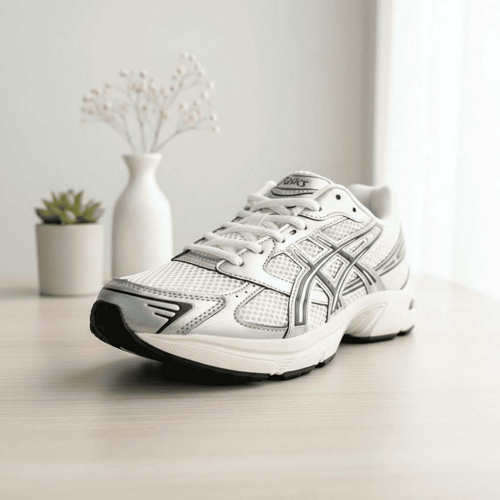 ASICS Retro Silver White Mesh Running Shoes—lightweight, breathable, with advanced cushioning and sleek urban design. Unisex style blends comfort, performance, and timeless streetwear appeal.
