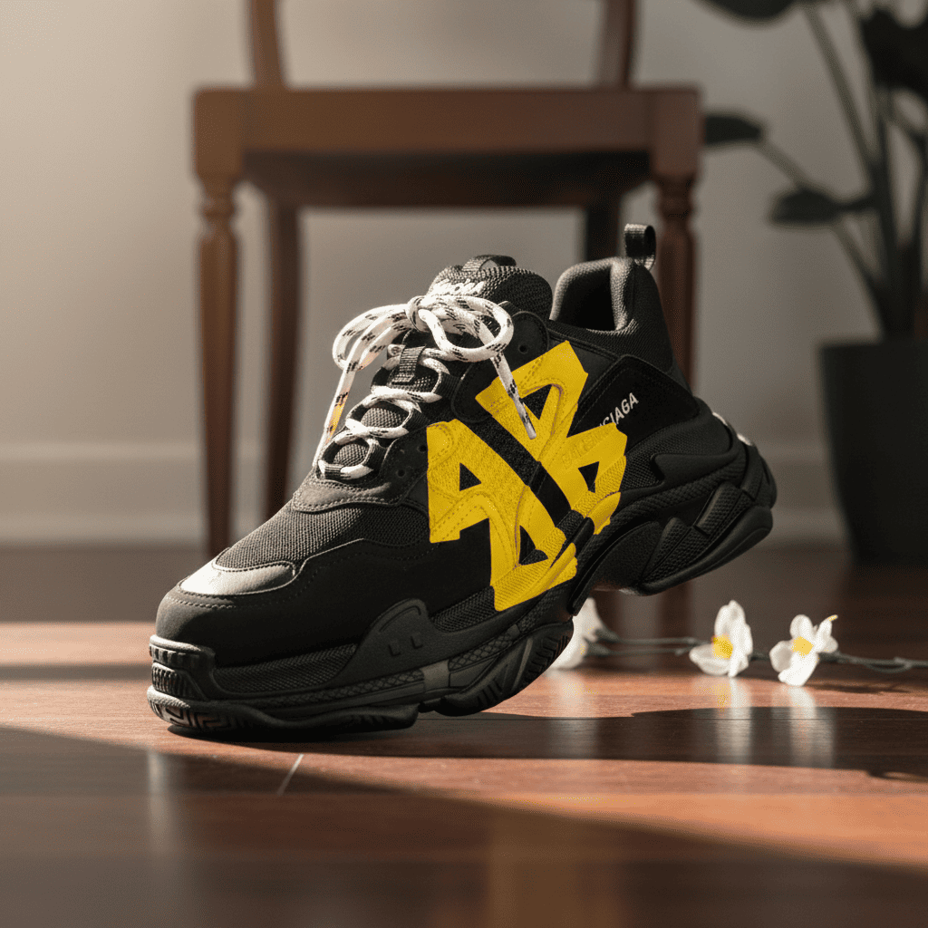 Balenciaga black chunky sneakers with bold 3D yellow “BB” logo, mesh and leather panels, deconstruction design, thick cushioned sole, unisex style for avant-garde 2020s street fashion comfort.
