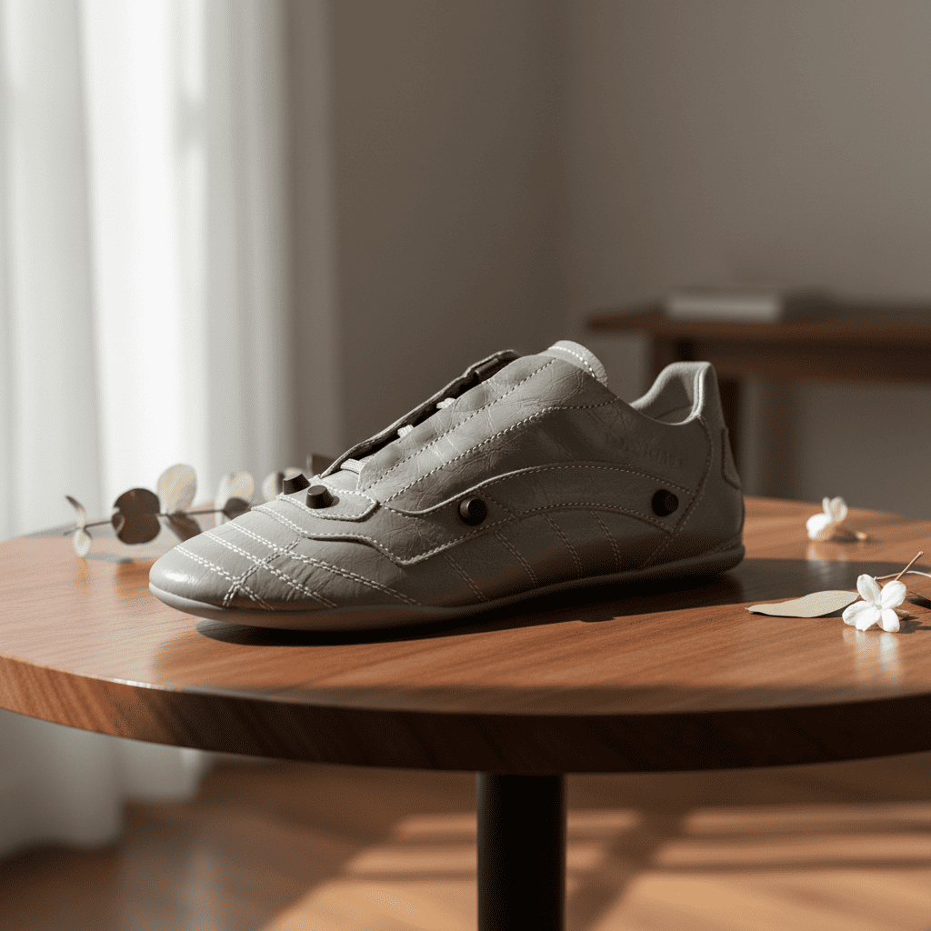 Balenciaga Grey Retro Sneakers with glossy leather, sleek streamlined design, fine stitching, lightweight comfort fit, unisex style blending street and haute couture elegance.
