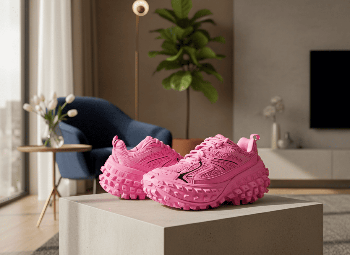 Balenciaga Pink Chunky Trail Sneakers feature popcorn rubber sole and breathable mesh panels, offering avant-garde street style, comfort, and a unisex modern urban athletic look.