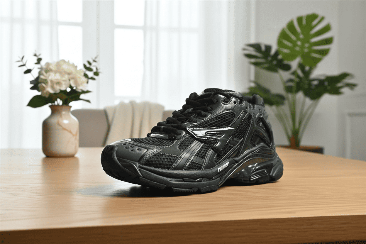 Balenciaga Runner Black Sneakers blend mesh and leather for a layered, breathable look. Thick cushioned sole with futuristic lines brings 90s retro meets modern street style. Unisex design.