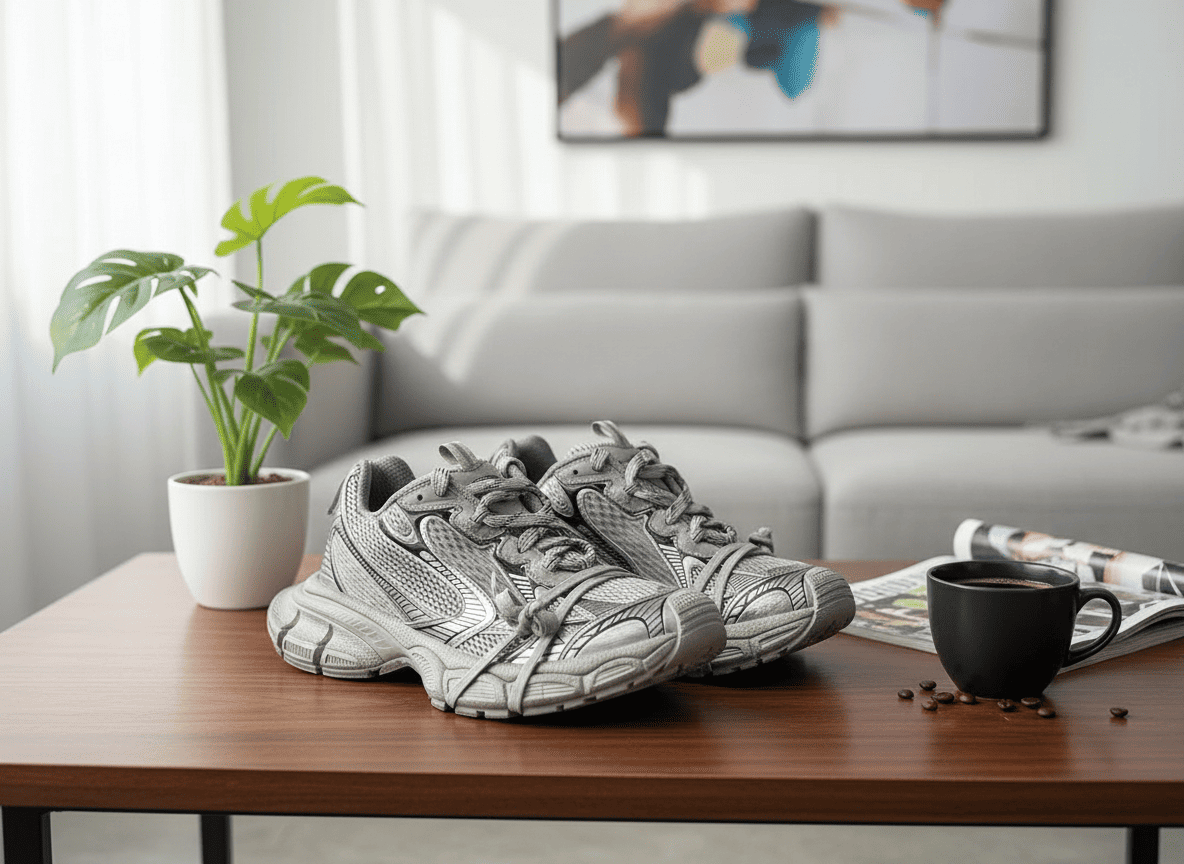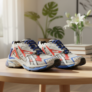 Balenciaga Grey Silver Track Sneakers feature layered mesh and TPU panels, futuristic design, cushioned chunky sole, multi-lace system, unisex fit—perfect for urban and streetwear style.