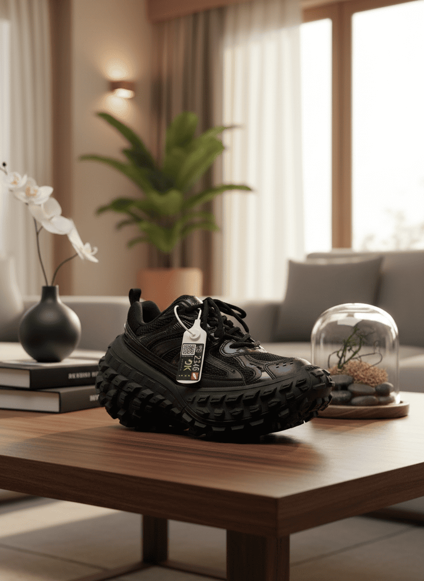 Balenciaga Black Thick Sole Trail Sneakers crafted with breathable mesh and durable rubber, featuring bold layered lines and rugged gear outsole for traction and cushioning. Unisex avant-garde urban style.