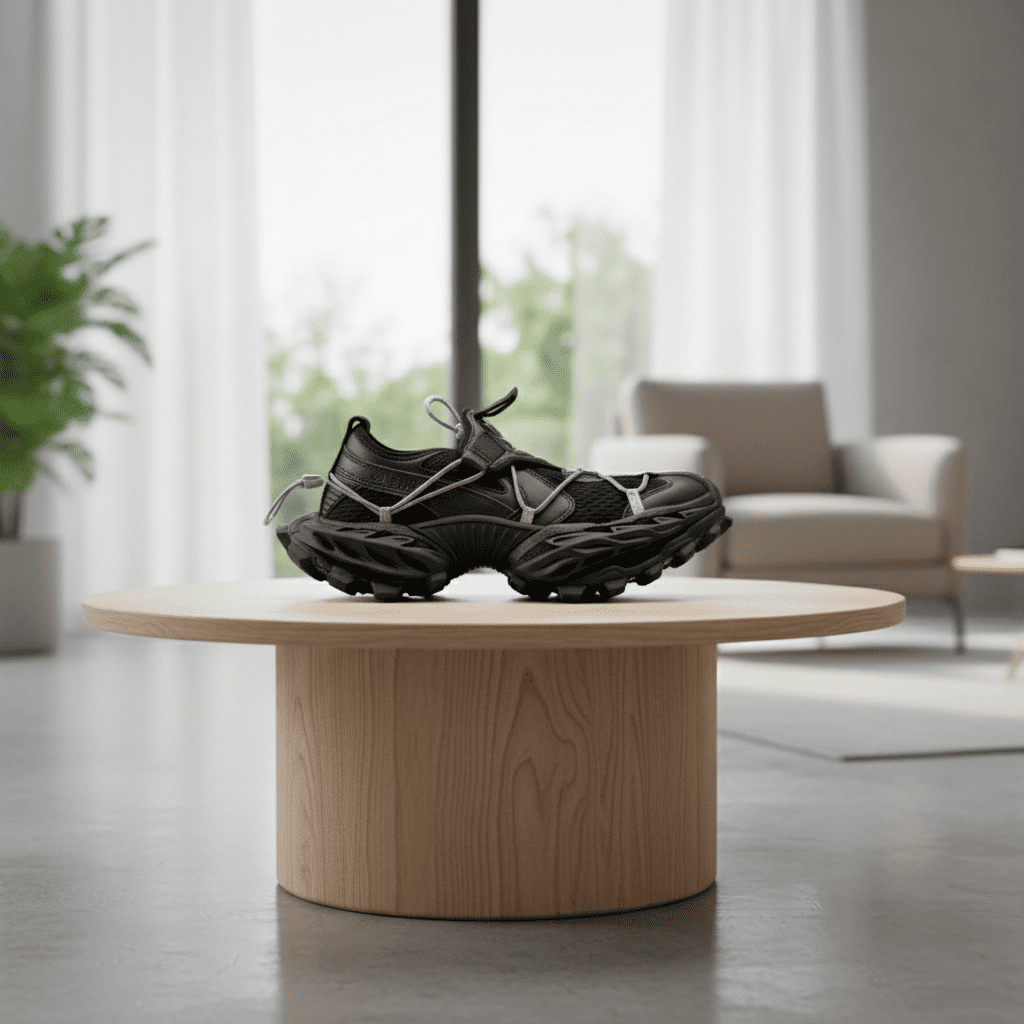 Balenciaga black tech sneakers with mesh and rubber mix, layered chunky sole for futuristic look, silver-gray laces add industrial edge, anti-slip outsole suits men and women street style.