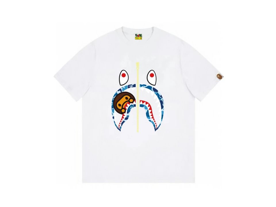 A Bathing Ape white shark camo T-shirt, made from heavyweight cotton, soft and breathable. Features iconic shark motif and Ape Head logo, loose unisex fit, perfect for 90s Harajuku street style.