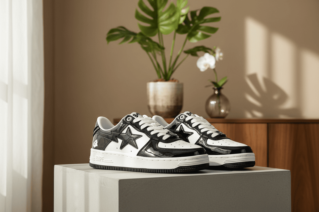 BAPE Bape Sta Black White Low Sneakers feature glossy patent leather, iconic star logo, retro street style, breathable comfort, and unisex trendy design for bold fashion expression.