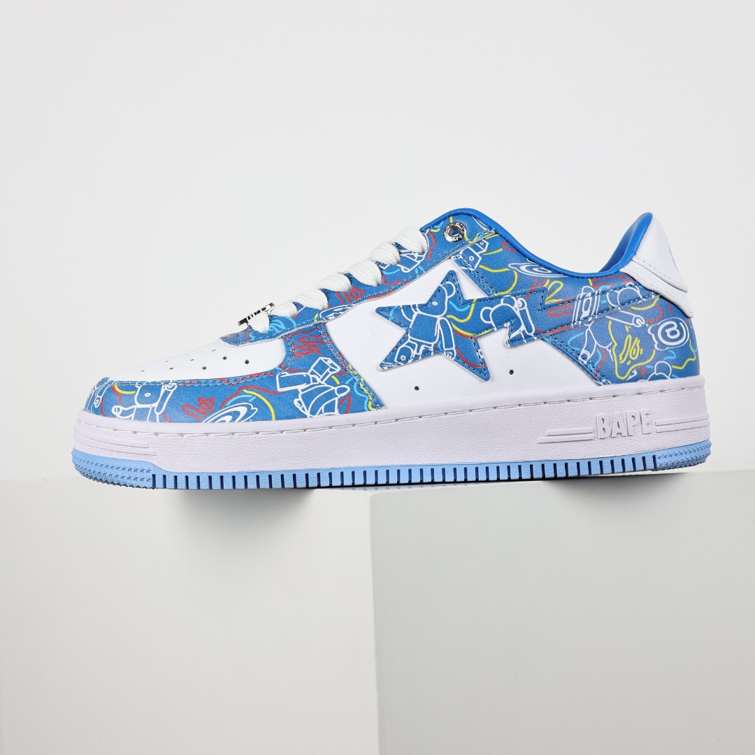 A Bathing Ape BAPE STA blue and white sneakers feature premium leather panels, graffiti-inspired abstract patterns, and a low-top streetwear design. Unisex, breathable, stylish, and urban-ready.