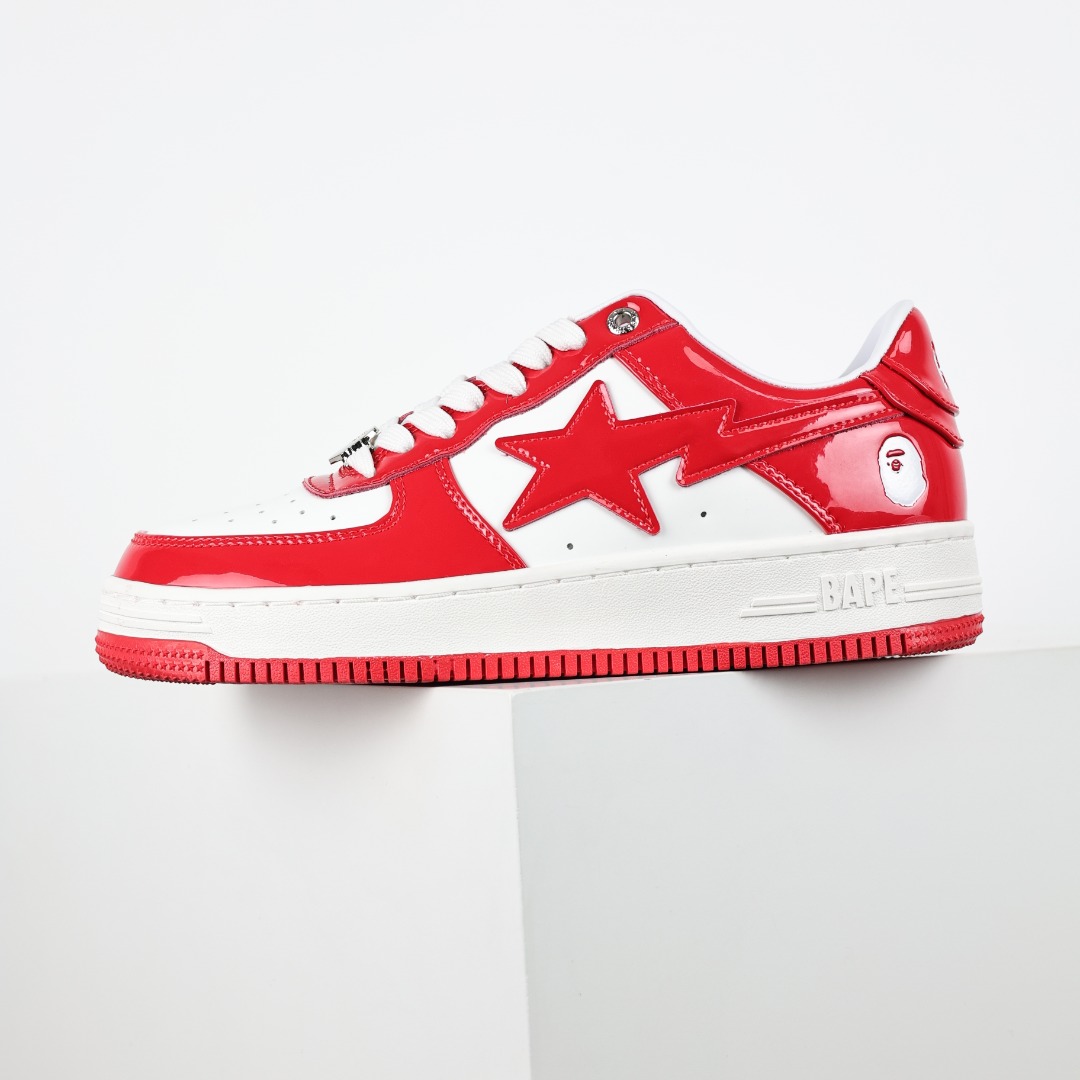 A Bathing Ape red and white BAPE STA low-top sneakers feature glossy patent leather, iconic star logo, Ape Head detail, retro basketball style, unisex design, and durable rubber sole for superior grip.