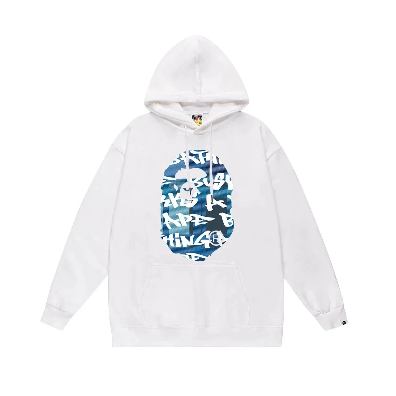 A Bathing Ape white hoodie crafted from premium cotton, featuring the iconic blue camo Ape Head print. Unisex relaxed fit with adjustable drawstring hood and front pocket for a trendy streetwear look.