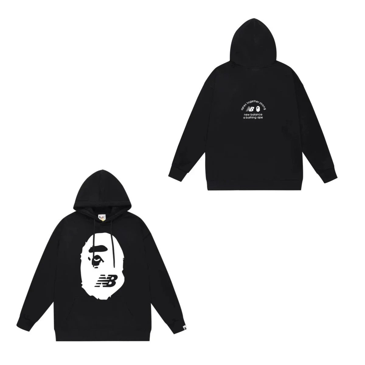 A Bathing Ape x New Balance black hoodie made from premium soft cotton, features iconic Ape Head and NB logo on chest, minimalist back design, unisex streetwear with bold urban style.