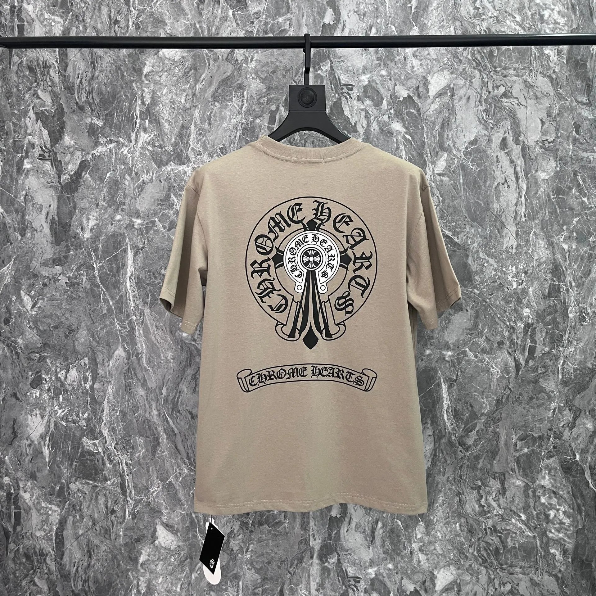 Chrome Hearts beige cotton T-shirt featuring signature black cross and circular logo print on back, classic crew neck design, unisex relaxed fit for effortless street-luxury style.
