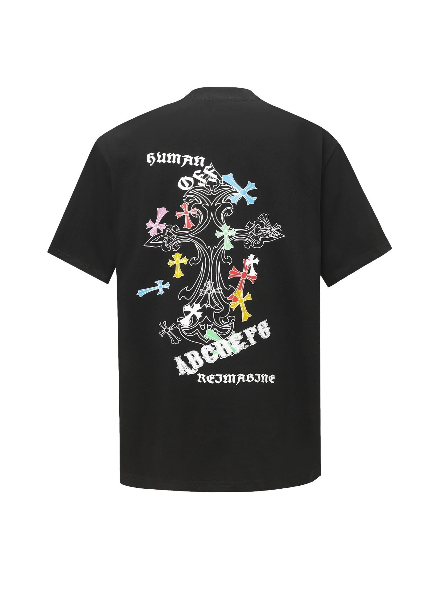 Chrome Hearts black heavy cotton unisex T-shirt with colorful cross graphic and gothic font, combining streetwear style and luxury comfort for modern casual wear.