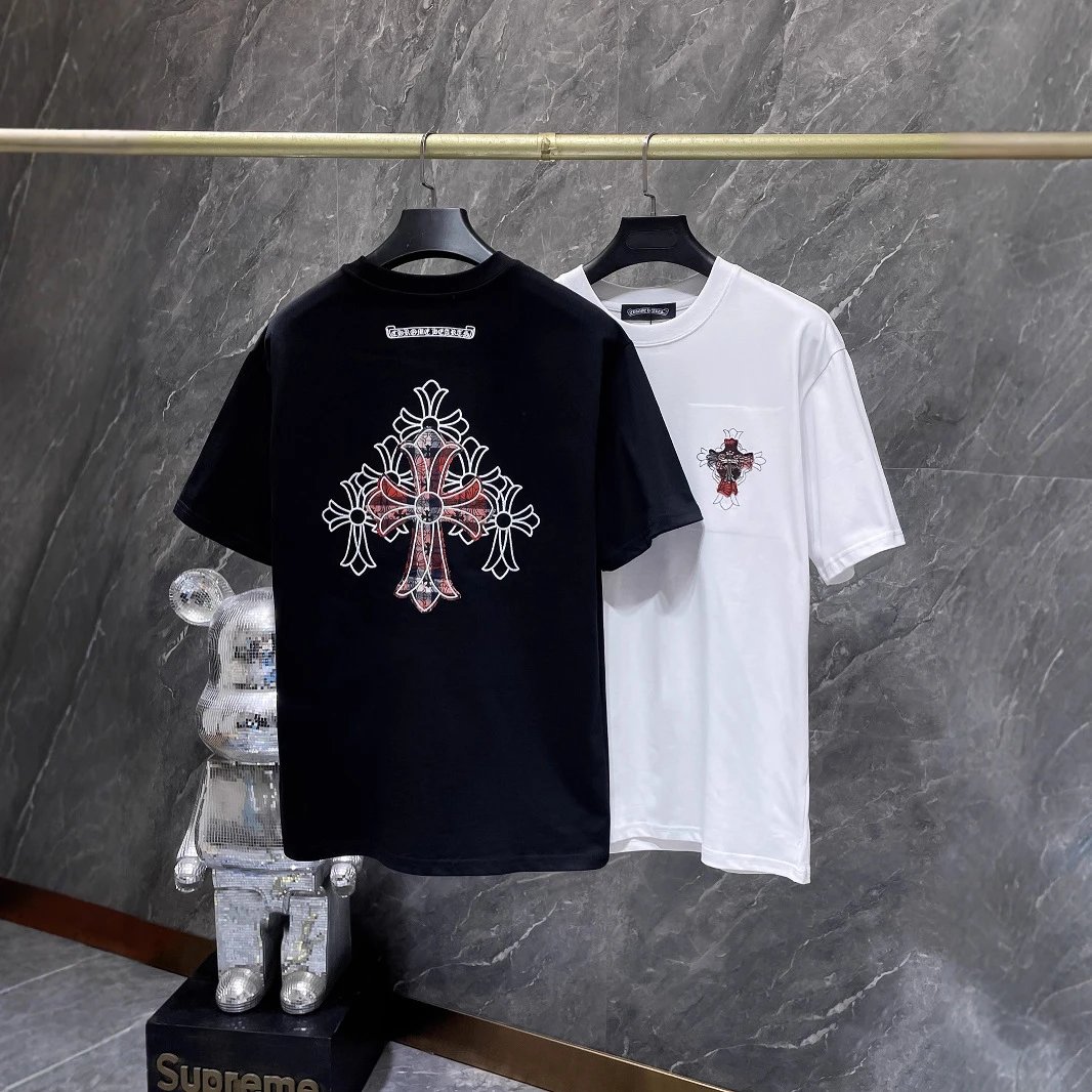 Chrome Hearts black cotton T-shirt with red silver cross motif, unisex streetwear-high fashion blend, soft breathable fabric, showcasing bold style and exquisite craftsmanship.