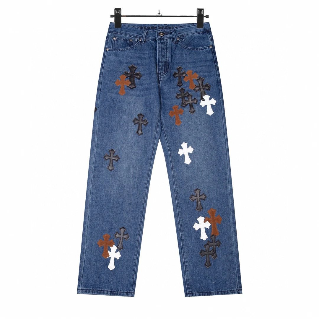 Chrome Hearts Blue Denim Jeans made from premium cotton fabric, featuring multicolor cross patches, relaxed straight-leg fit, unisex design for a vintage streetwear style.