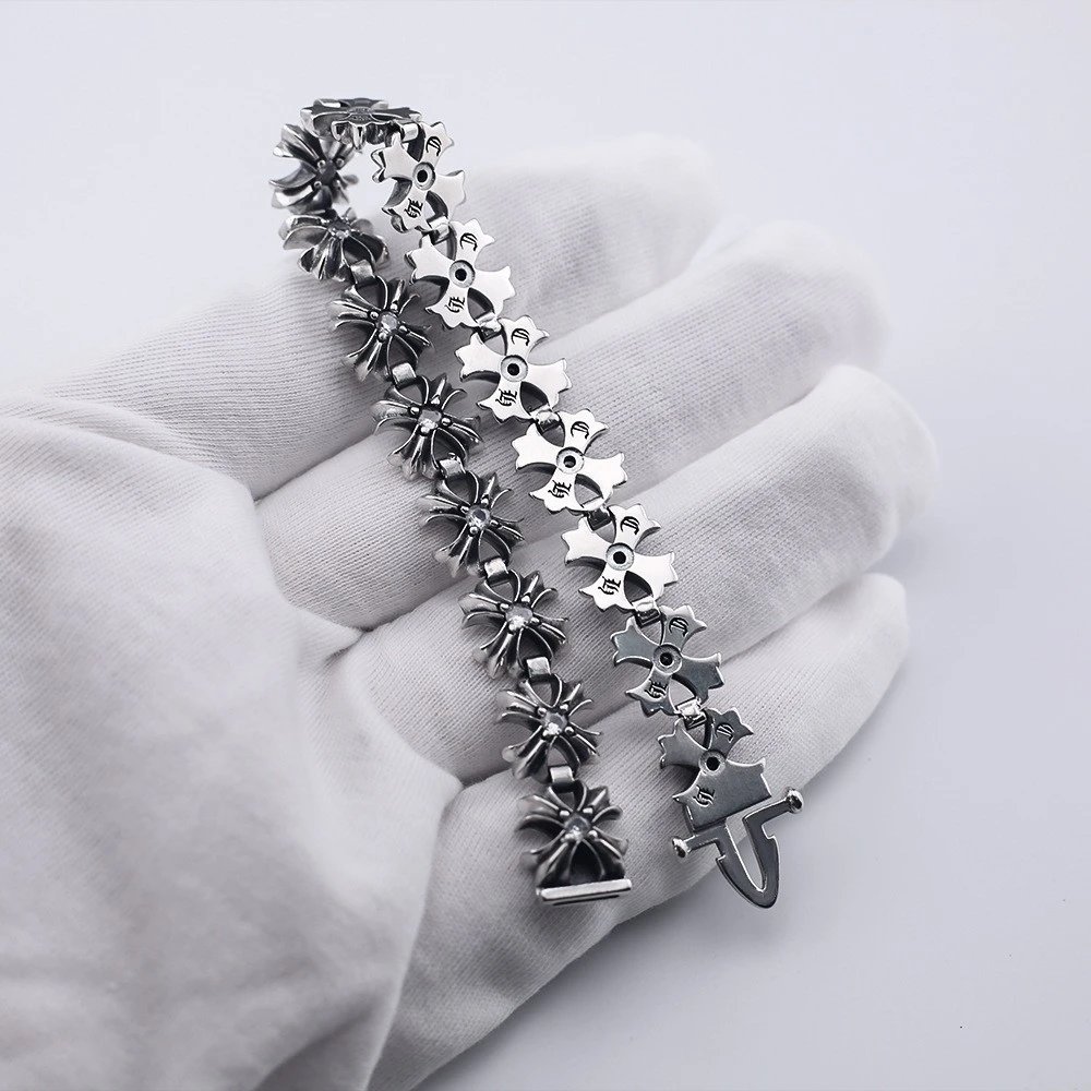 Chrome Hearts Silver Cross Bracelet crafted from 925 sterling silver with Gothic cross links, heavy texture and fine detail. Rock-inspired punk style, signature clasp, unisex, perfect for street or luxury fashion.