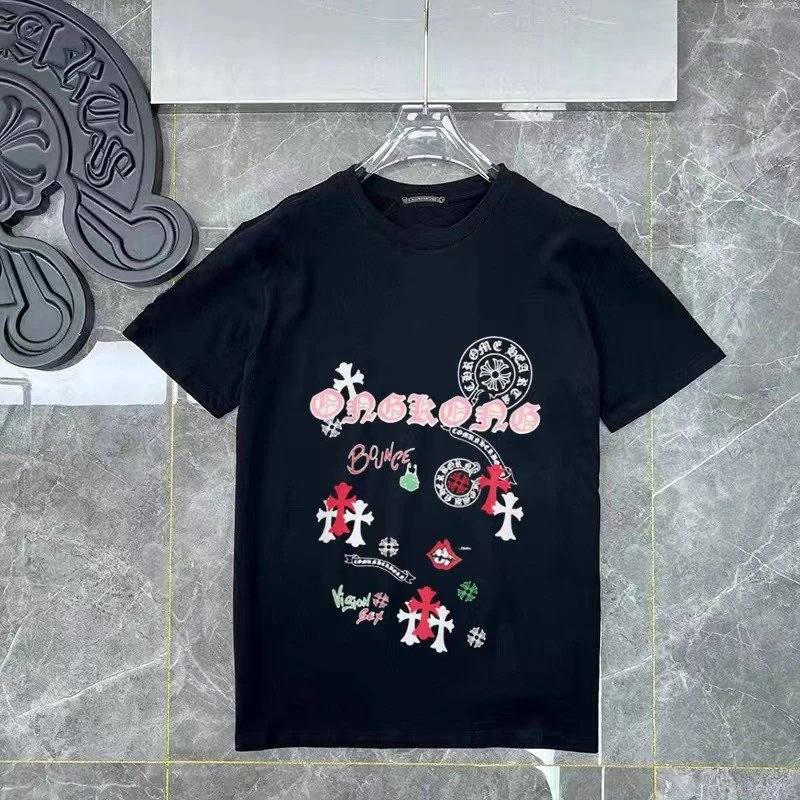Chrome Hearts Black Men's Cotton T-Shirt featuring multiple cross logos and bold letter prints. Soft, breathable fabric with a round neck cut blends street art style with modern casual fashion.