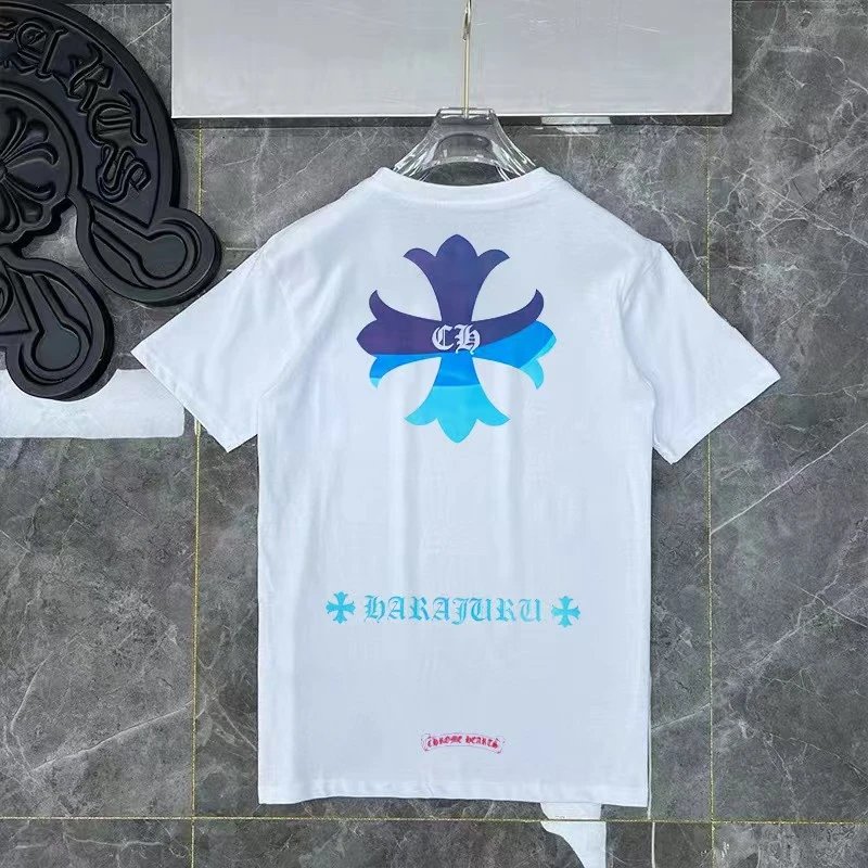 Chrome Hearts white cotton T-shirt features a blue gradient cross logo with CH emblem and HARAJUKU print, blending American streetwear and Harajuku style. Unisex, soft, breathable, and stylish.