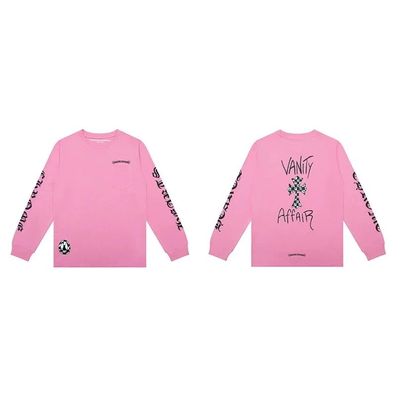 Chrome Hearts Pink Long Sleeve T-Shirt crafted from premium cotton, features chest pocket, Gothic sleeve prints, cross logo with “VANITY AFFAIR” on back, unisex streetwear with bold high-fashion attitude.