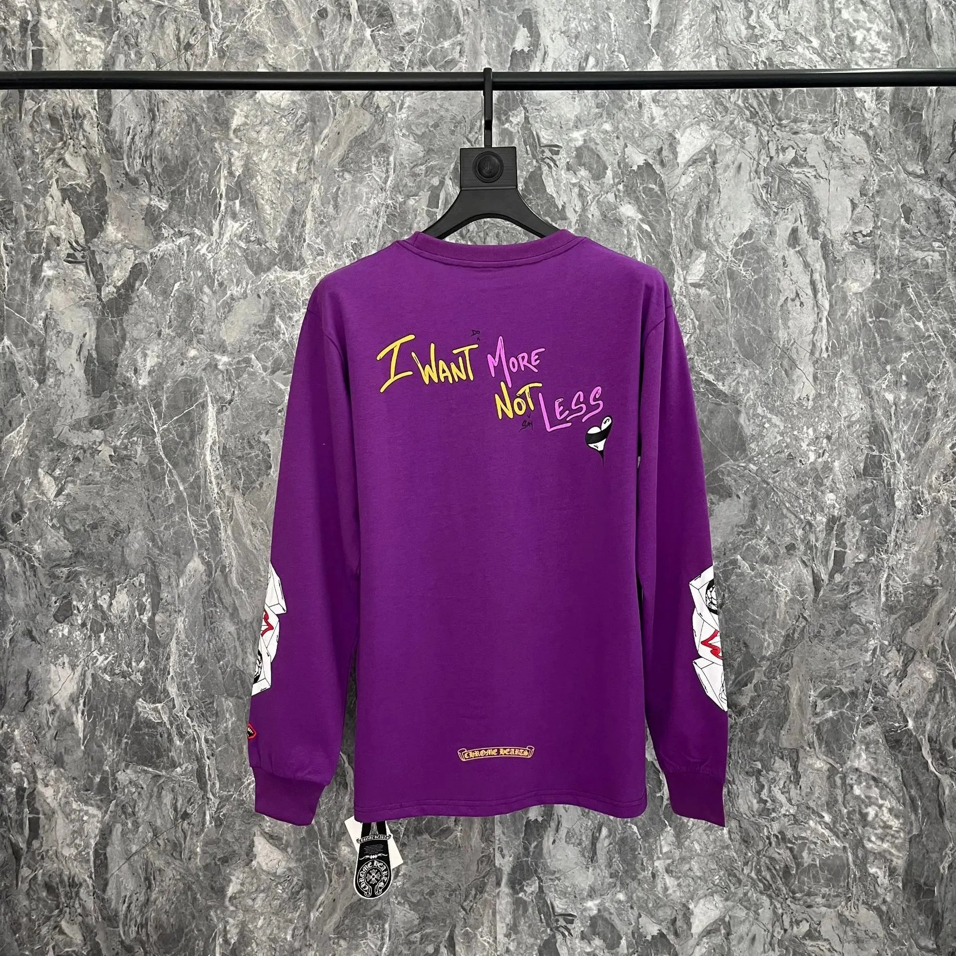 Chrome Hearts Purple Long Sleeve T-Shirt made from premium cotton, featuring bold “I WANT MORE NOT LESS” graffiti and unique sleeve prints. Unisex streetwear style for free-spirited trendsetters.