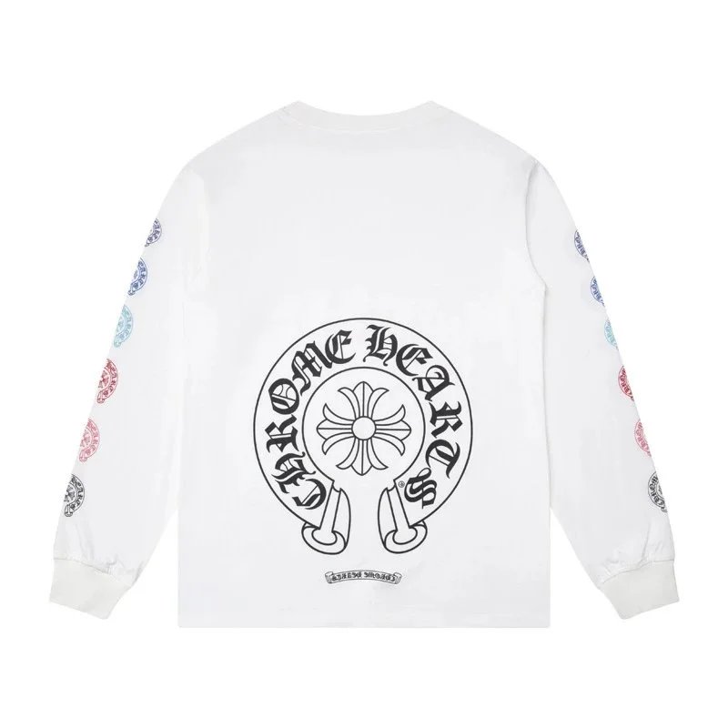 Chrome Hearts white long sleeve T-shirt crafted from soft cotton, featuring classic black cross logo on back, colorful sleeve motifs, unisex design blending minimalism with vintage street style.