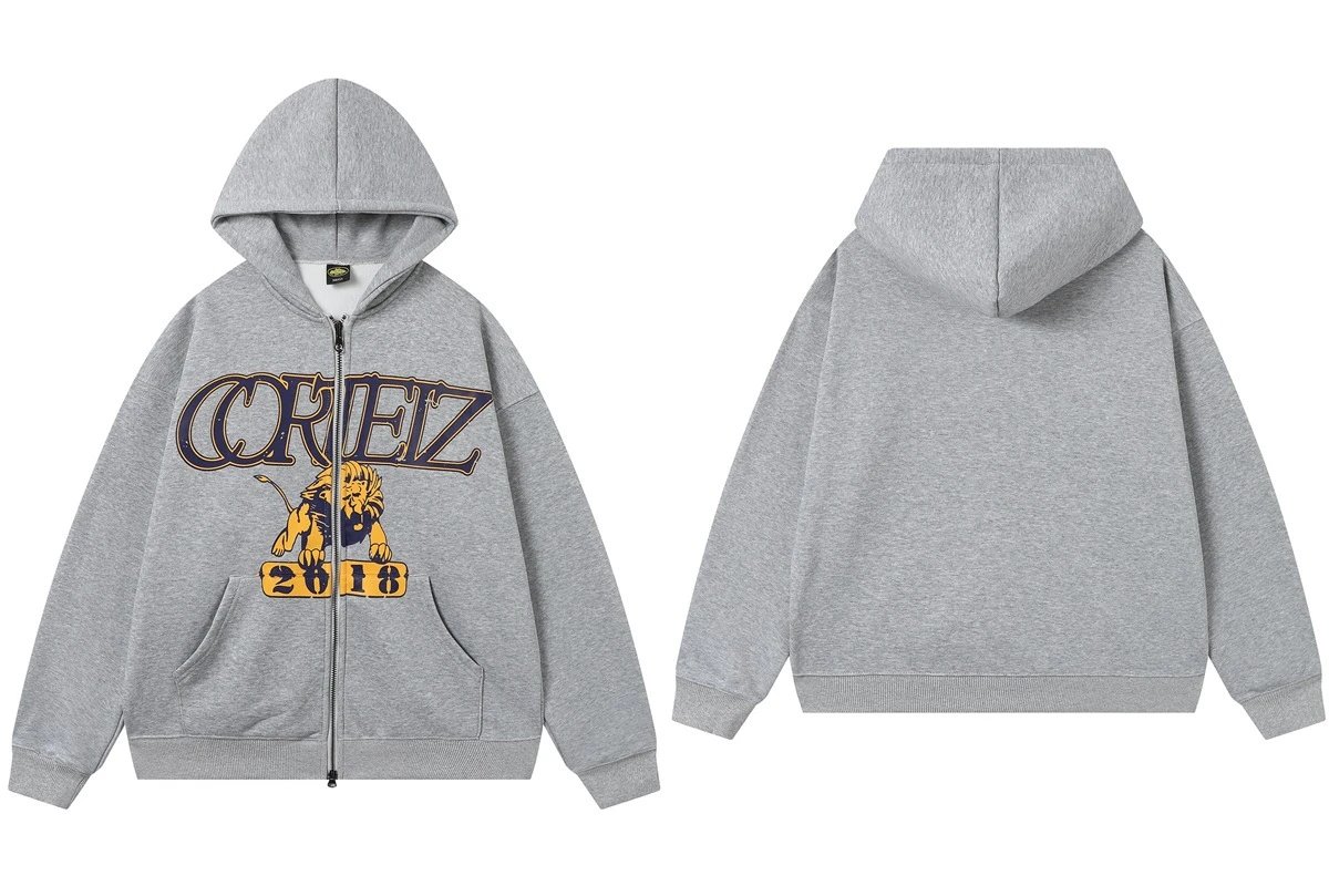 Corteiz Grey Zip Hoodie features a bold lion emblem and vintage logo print, crafted from premium cotton blend for comfort and warmth. Unisex loose fit brings urban street style confidence.